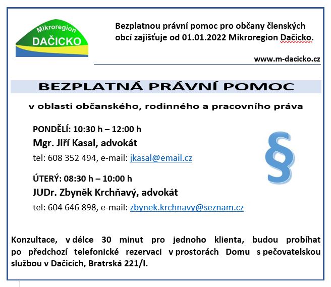 Bezplatnou právní pomoc pro občany členských obcí zajištuje od 1.1.2022 Mikroregion Dačicko